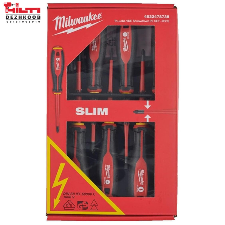 ست پیچگوشتی ۷ عددی عایق برق میلواکی مدل 4932478738 یک مجموعه حرفهای و ایمن برای تکنسینها و برقکارانی است که با تجهیزات ولتاژ بالا کار میکنند. این مجموعه دارای استاندارد VDE است و هر پیچگوشتی تا ۱۰٬۰۰۰ ولت تست شده و برای استفاده ایمن تا ۱٬۰۰۰ ولت تأیید شده است.